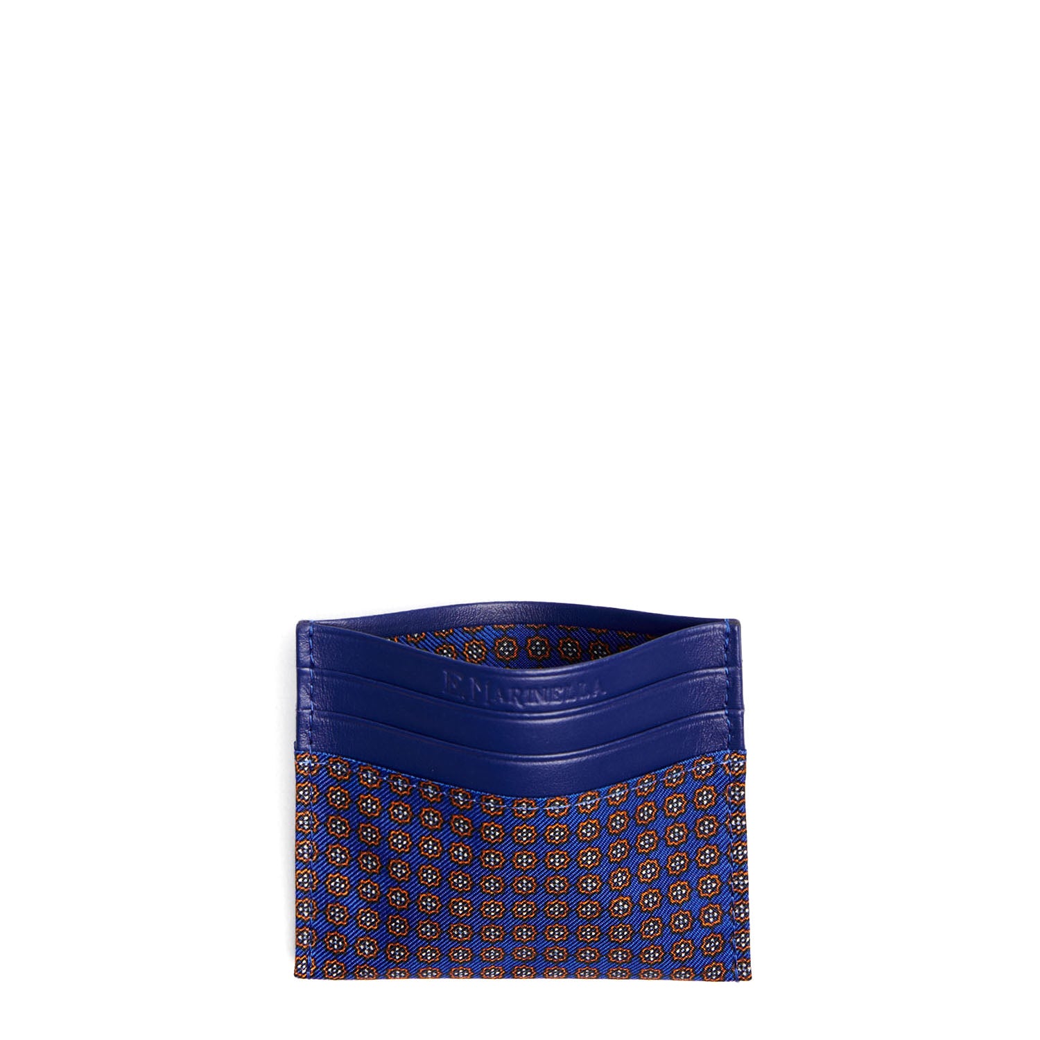La seta microfantasia stampata a mano impreziosisce e rende unico questo piccolo accessorio comodo e compatto, arricchendone di colore e contrasti la base in pelle. Il prodotto è realizzato completamente a mano.