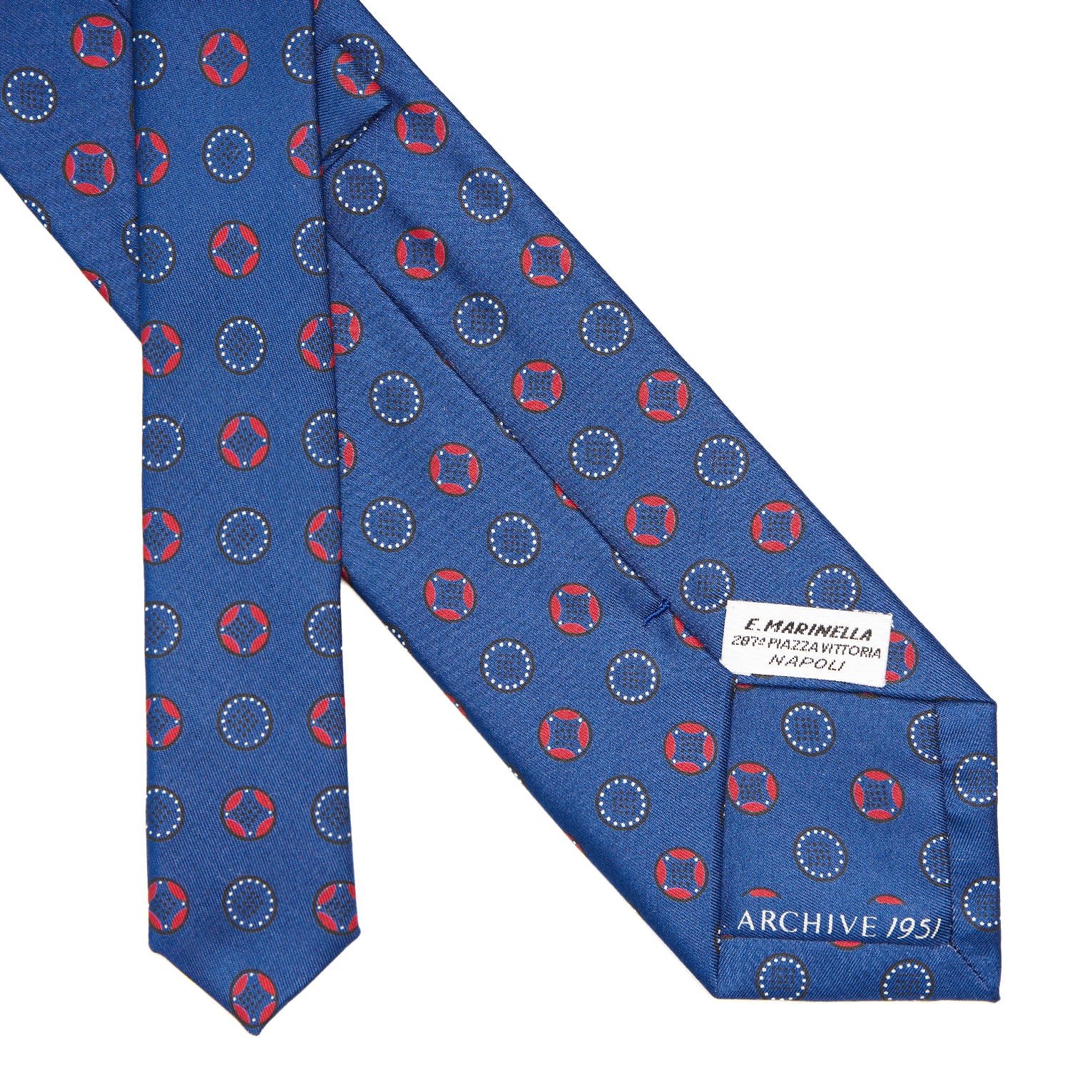 La cravatta fa parte della collezione Archivio, che propone in chiave moderna le stampe storiche dal 1930 al 1980. Le fantasie degli anni '50 sono caratterizzate da fantasie più piccole e fitte. Fa il suo ingresso il "fiorellino", elemento tipico delle fantasie Marinella. Un ritorno anche del paisley nella versione più tradizionale talvolta accostato apiccoli fiorellini, spesso tono su tono. Una cravatta classica con tocchi di originalità.