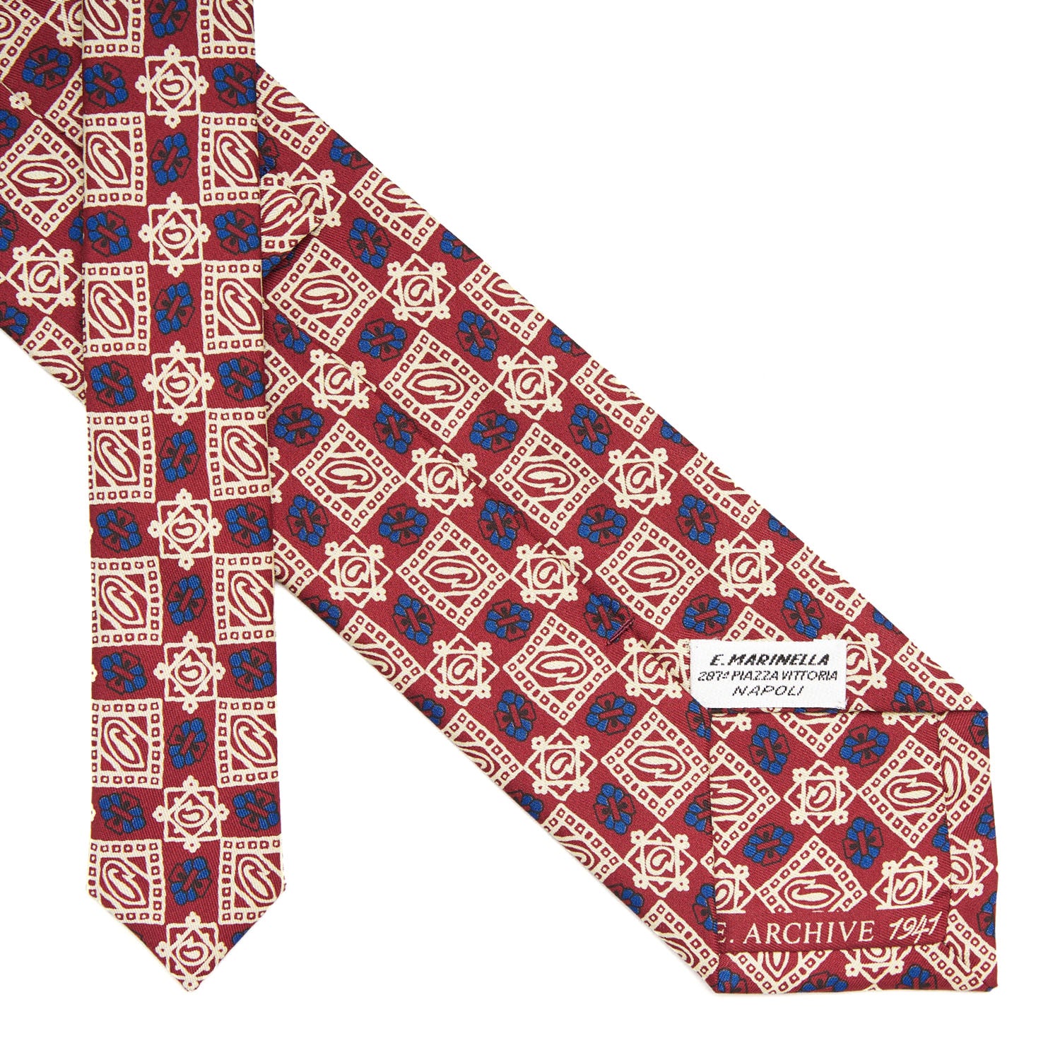 La cravatta fa parte della collezione Archivio che propone, in chiave moderna, le stampe storiche dal 1930 al 1980 su tessuti di grammatura più leggera, come ad inizio secolo. Le fantasie degli anni '40 sono caratterizzate da colori sobri, con una predominanza di blue e bordeaux, talvolta illuminati dall'azzurro, e disegni importanti, risultato di una combinazione di piccoli disegni. Una cravatta che appare rigorosa.ma con un tocco comunque trendy.