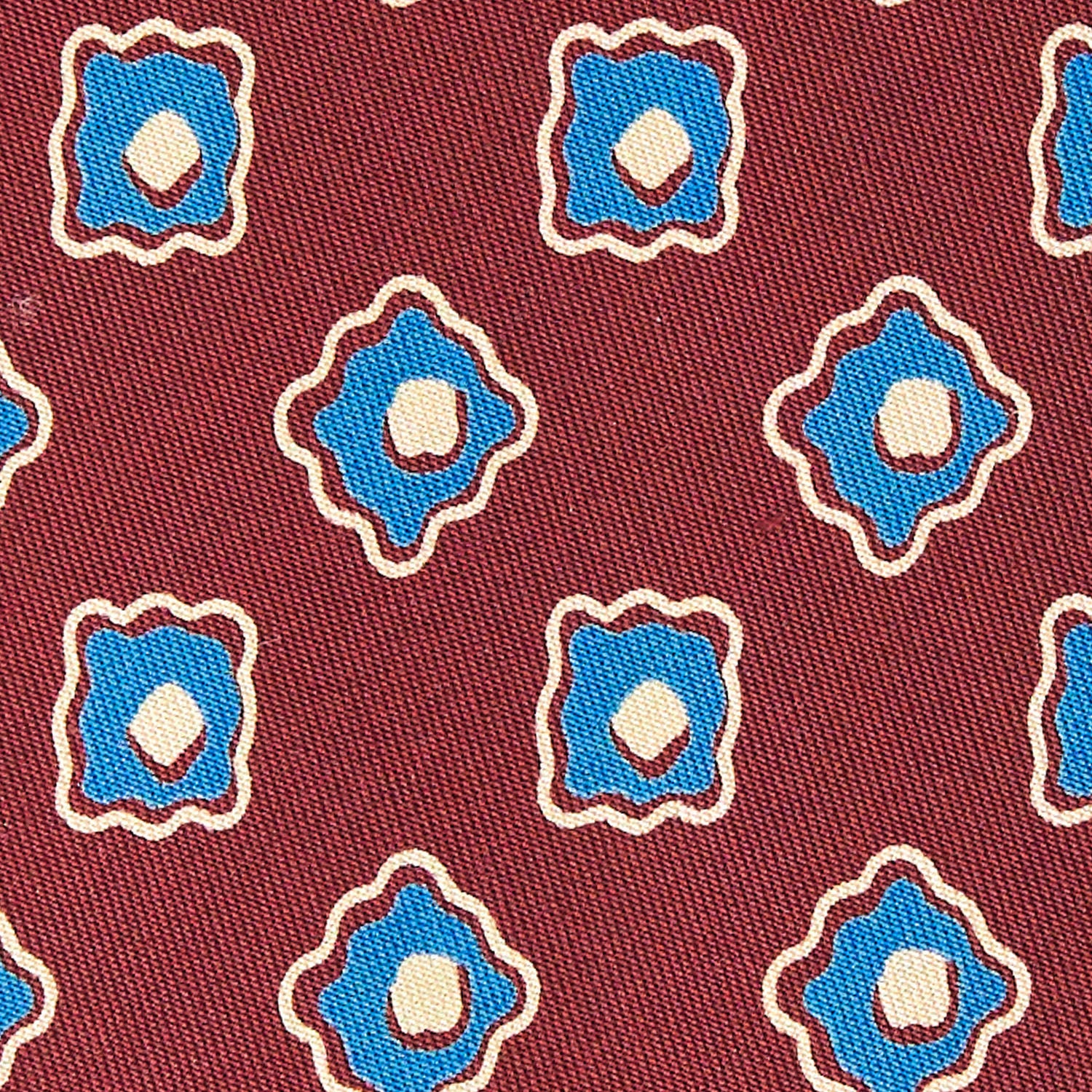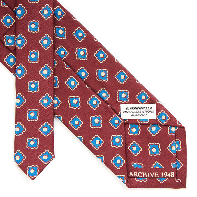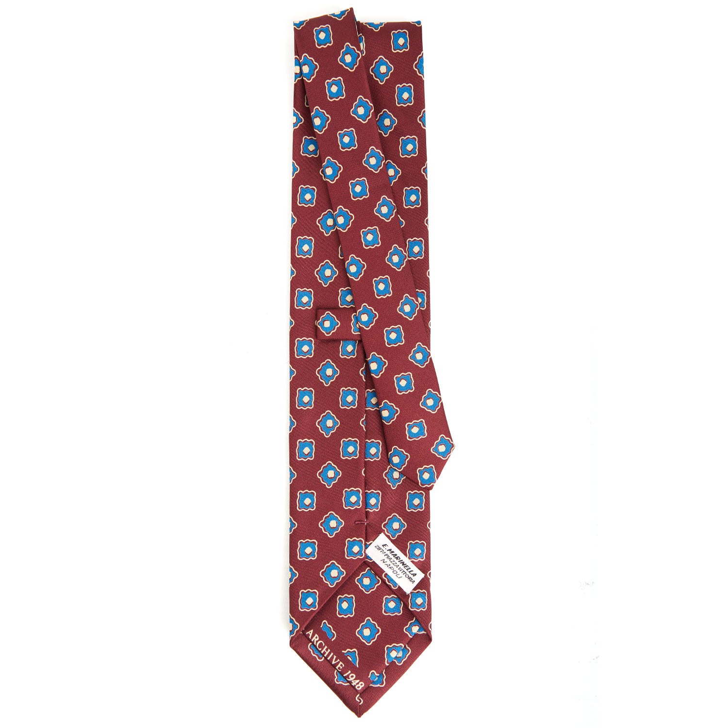 La cravatta fa parte della collezione Archivio che propone, in chiave moderna, le stampe storiche dal 1930 al 1980 su tessuti di grammatura più leggera, come ad inizio secolo. Le fantasie degli anni '40 sono caratterizzate da colori sobri, con una predominanza di blue e bordeaux, talvolta illuminati dall'azzurro, e disegni importanti, risultato di una combinazione di piccoli disegni. Una cravatta che appare rigorosa.ma con un tocco comunque trendy.