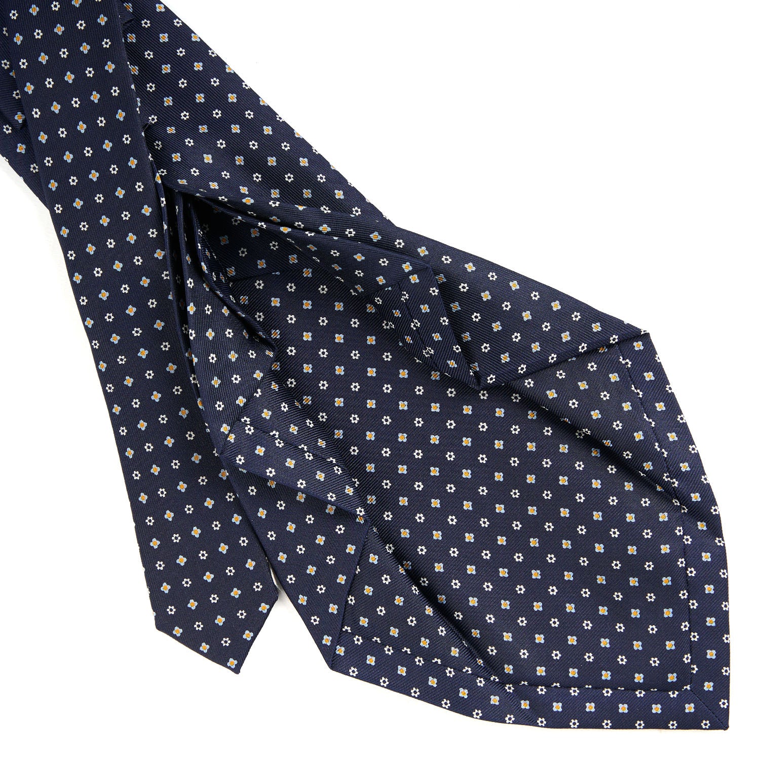 La cravatta 7 pieghe E. Marinella è un prodotto totalmente artigianale, dalla stampa a mano della seta al taglio singolo del tessuto, alla chiusura del prodotto finito. Si tratta di una cravatta molto preziosa perché la quantità di seta impiegata è maggiore: lo square di seta viene piegato sette volte su se stesso donando alla cravatta una maggiore consistenza, anche all'altezza del nodo, e pesantezza.