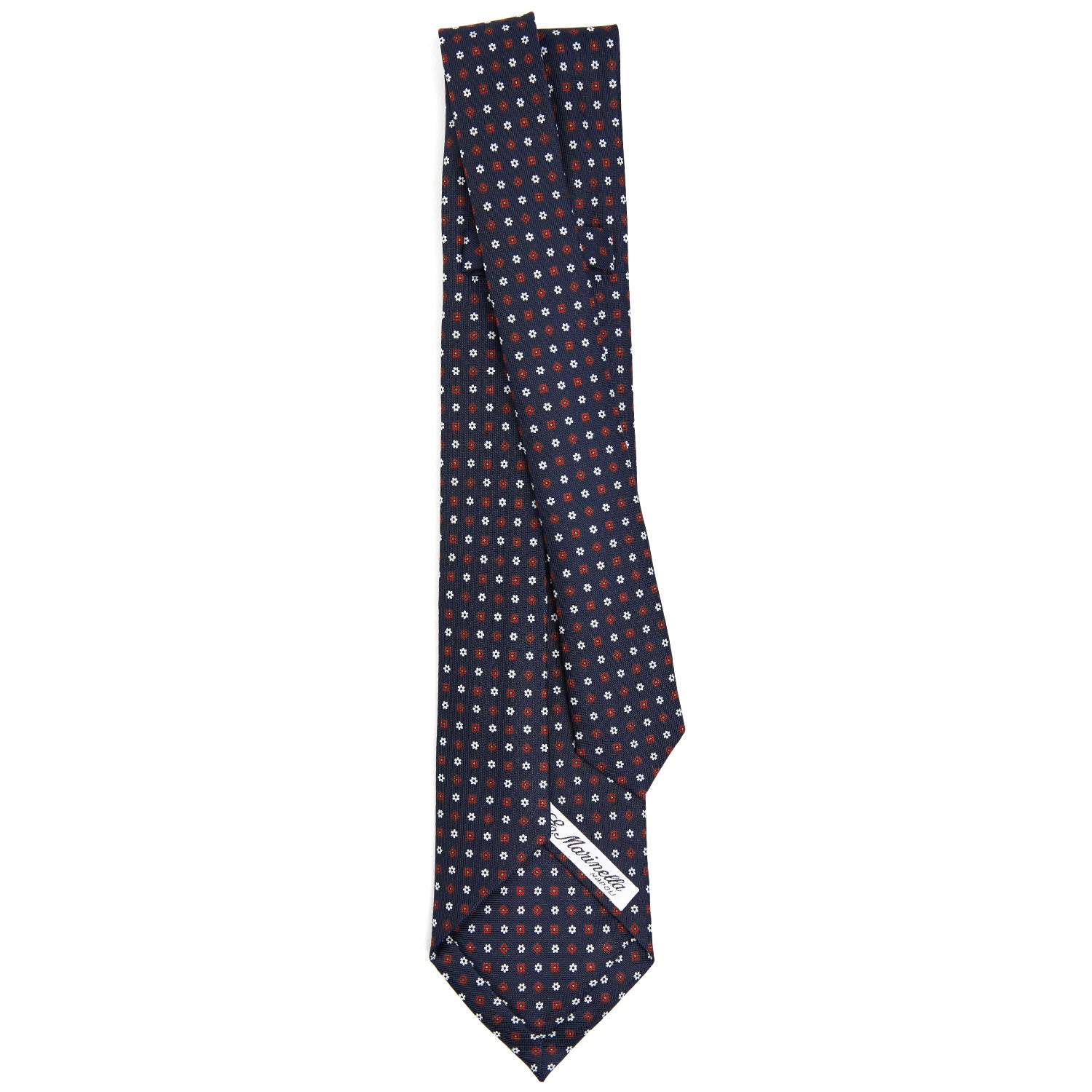 La cravatta 9 pieghe E. Marinella è un prodotto totalmente artigianale, dalla stampa a mano della seta al taglio singolo del tessuto, alla chiusura del prodotto finito. Si tratta di una cravatta molto preziosa perché la quantità di seta impiegata è maggiore: lo square di seta viene piegato nove volte su se stesso donando alla cravatta una maggiore consistenza, anche all'altezza del nodo, e pesantezza.