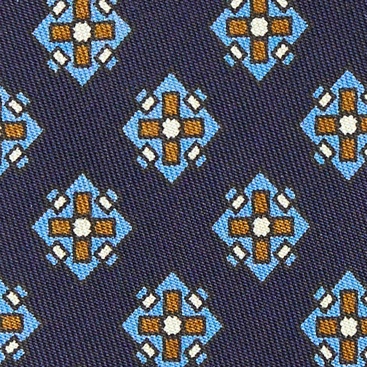 La cravatta fa parte della collezione Archivio che propone, in chiave moderna, le stampe storiche dal 1930 al 1980 su tessuti di grammatura più leggera, come ad inizio secolo. Le fantasie degli anni '40 sono caratterizzate da colori sobri, con una predominanza di blue e bordeaux, talvolta illuminati dall'azzurro, e disegni importanti, risultato di una combinazione di piccoli disegni. Una cravatta che appare rigorosa.ma con un tocco comunque trendy.