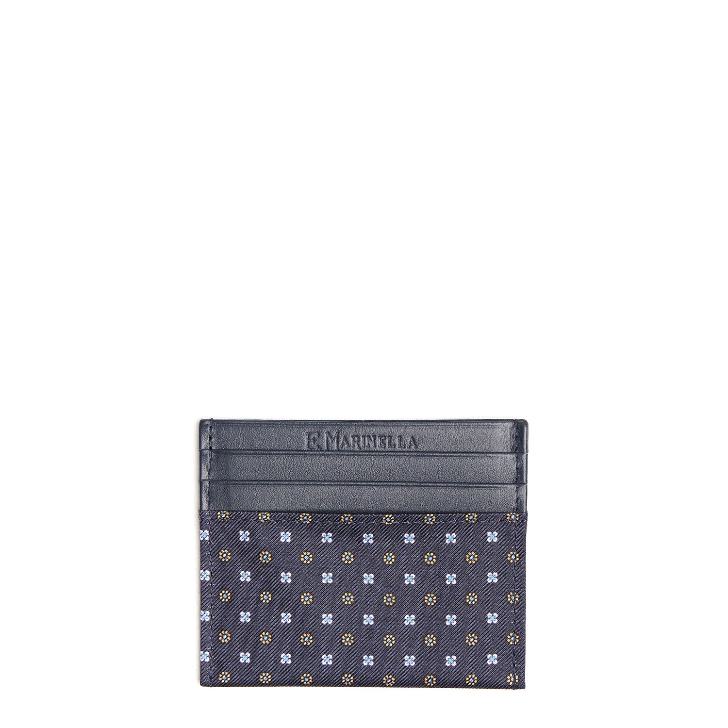 La seta microfantasia stampata a mano impreziosisce e rende unico questo piccolo accessorio comodo e compatto, arricchendone di colore e contrasti la base in pelle. Il prodotto è realizzato completamente a mano.