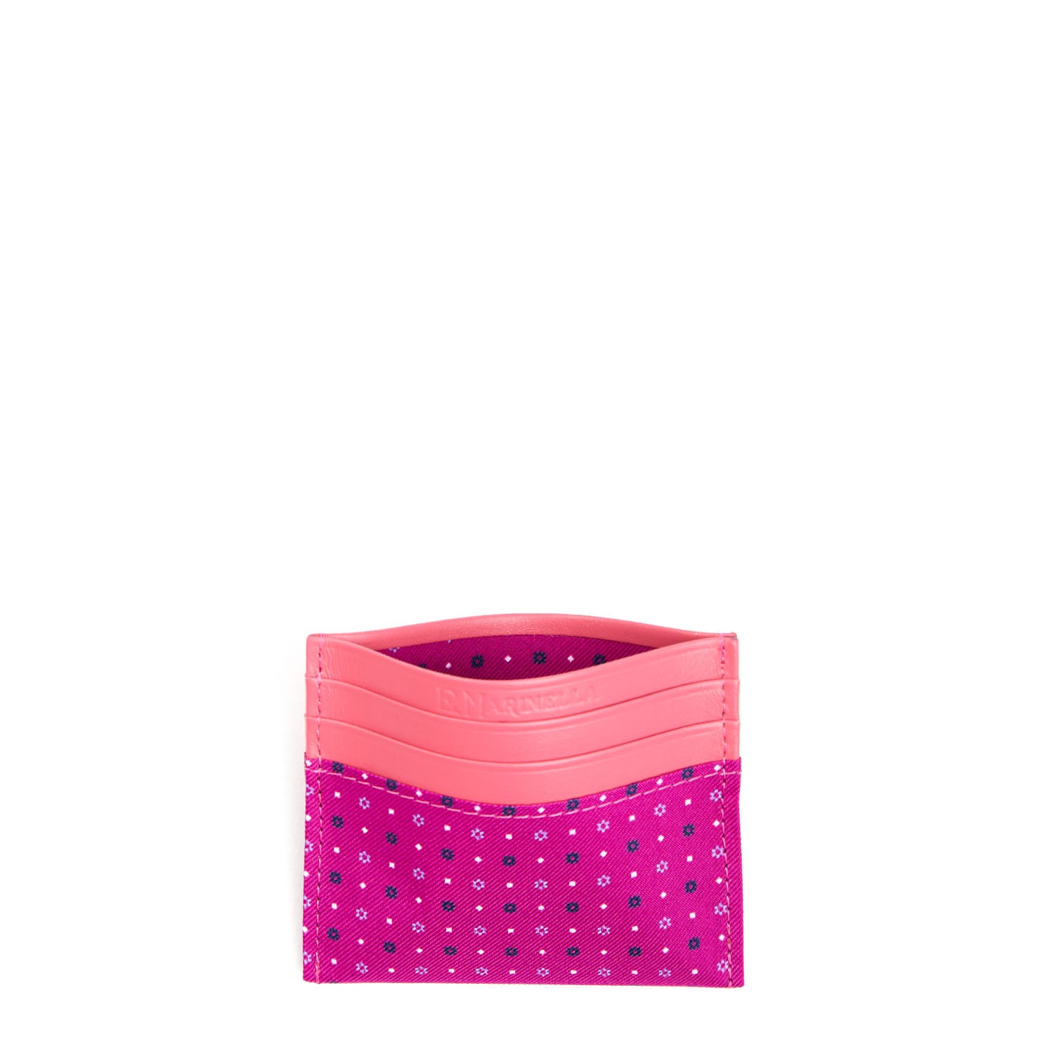 La seta microfantasia stampata a mano impreziosisce e rende unico questo piccolo accessorio comodo e compatto, arricchendone di colore e contrasti la base in pelle. Il prodotto è realizzato completamente a mano.