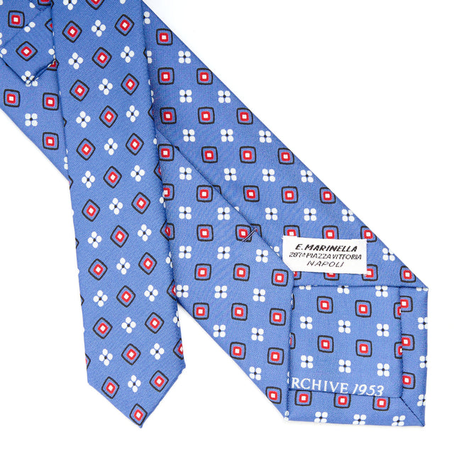 La cravatta fa parte della collezione Archivio, che propone in chiave moderna le stampe storiche dal 1930 al 1980. Le fantasie degli anni '50 sono caratterizzate da fantasie più piccole e fitte. Fa il suo ingresso il "fiorellino", elemento tipico delle fantasie Marinella. Un ritorno anche del paisley nella versione più tradizionale talvolta accostato apiccoli fiorellini, spesso tono su tono. Una cravatta classica con tocchi di originalità.
