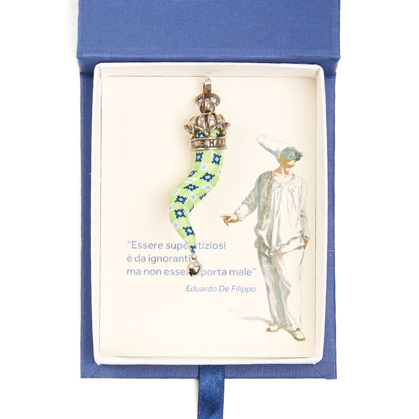 Piccolo portafortuna arricchito dalle classiche fantasie E. Marinella, con finiture in metallo argentato.