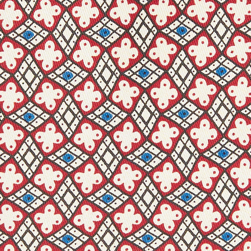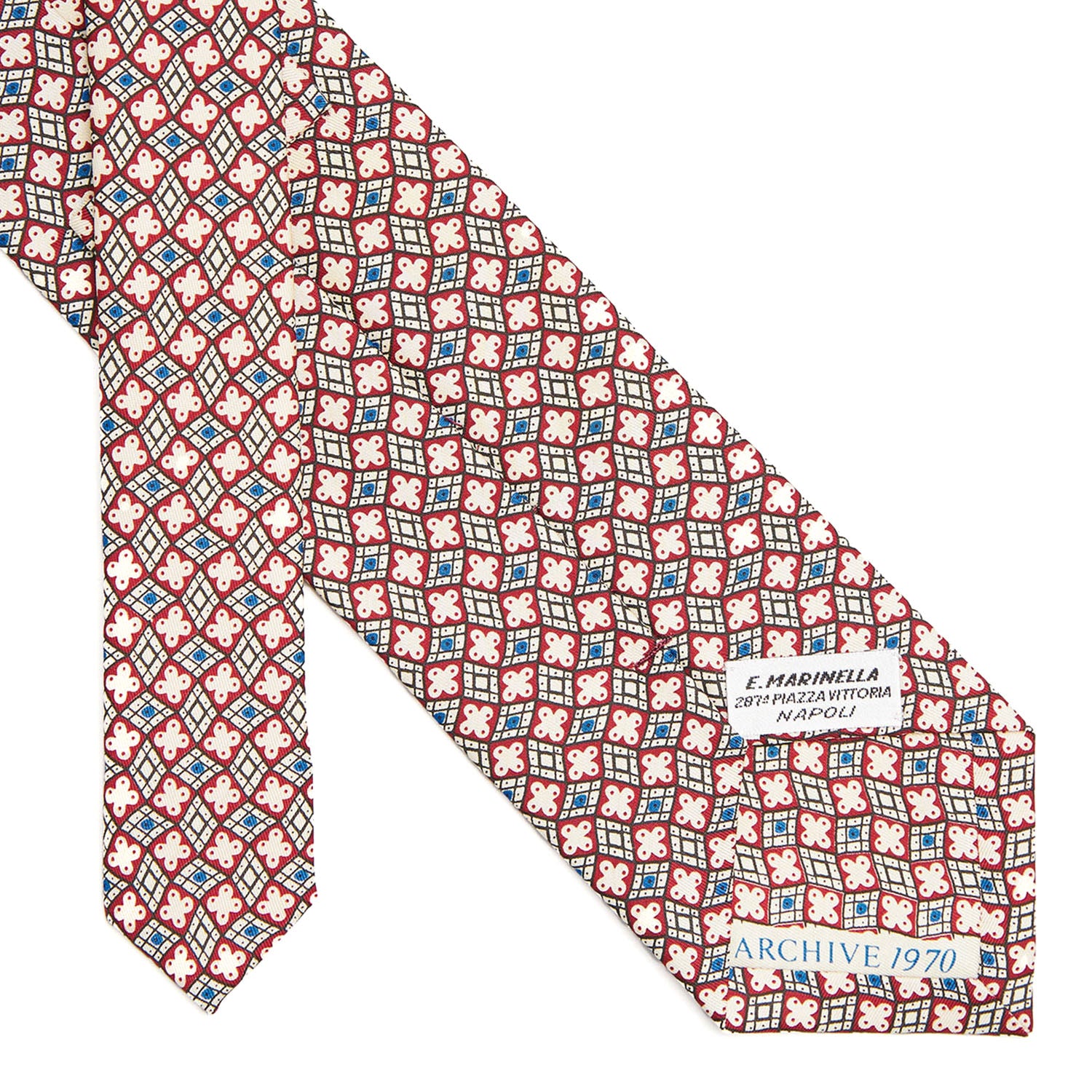 La cravatta fa parte della collezione Archivio, che propone in chiave moderna le stampe storiche dal 1930 al 1980. Gli anni '70 sono caratterizzati da motivi più vivaci e densi, a volte anche barocchi. I colori sono chiari con sprazzi di arancio, rosso brillante e bianco. Una cravatta dal carattere prepotente.