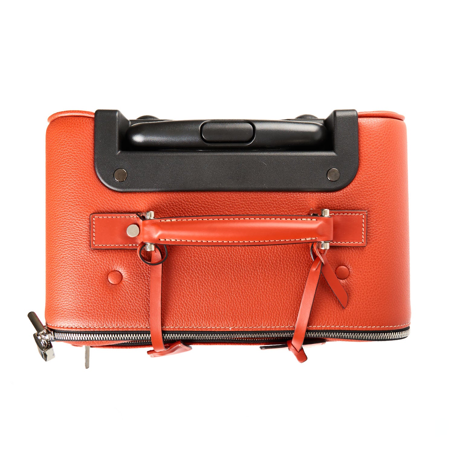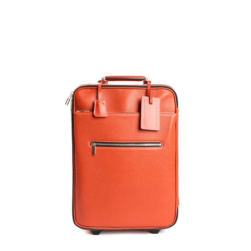 Un elegante trolley semirigido, 2 ruote, con scocca in policarbonato e inserti in vitello. La tasca anteriore permette un ottima ripartizione degli spazi. Manico estendibile e chiusura con lucchetto. Made in Italy