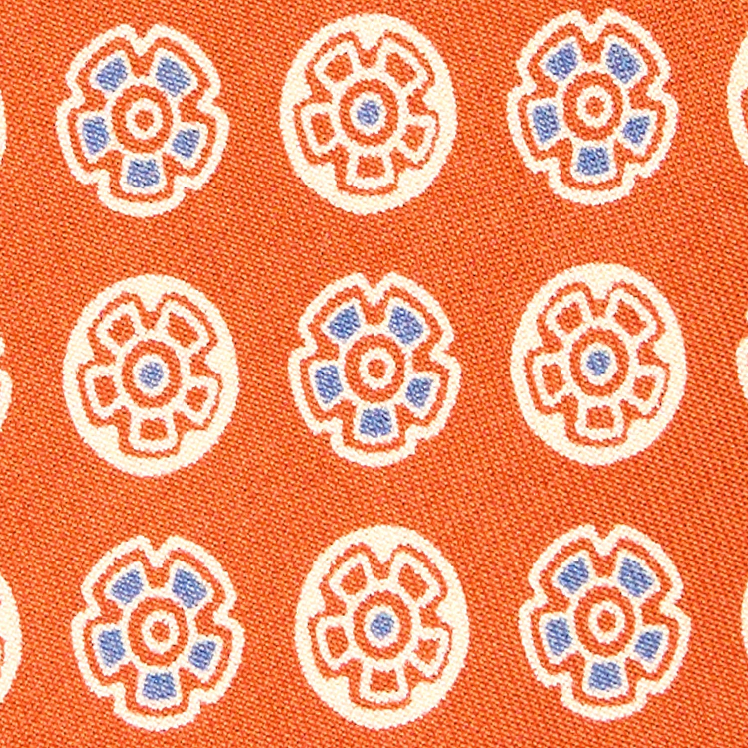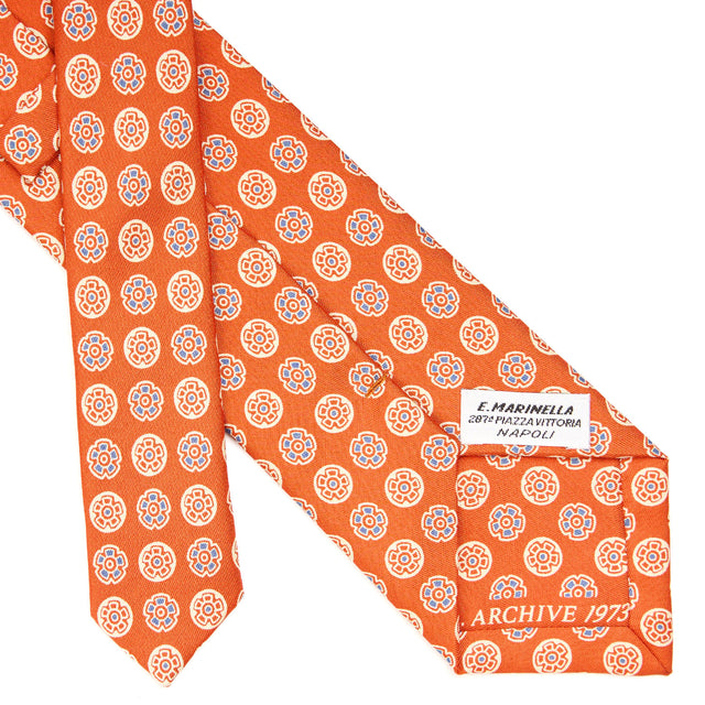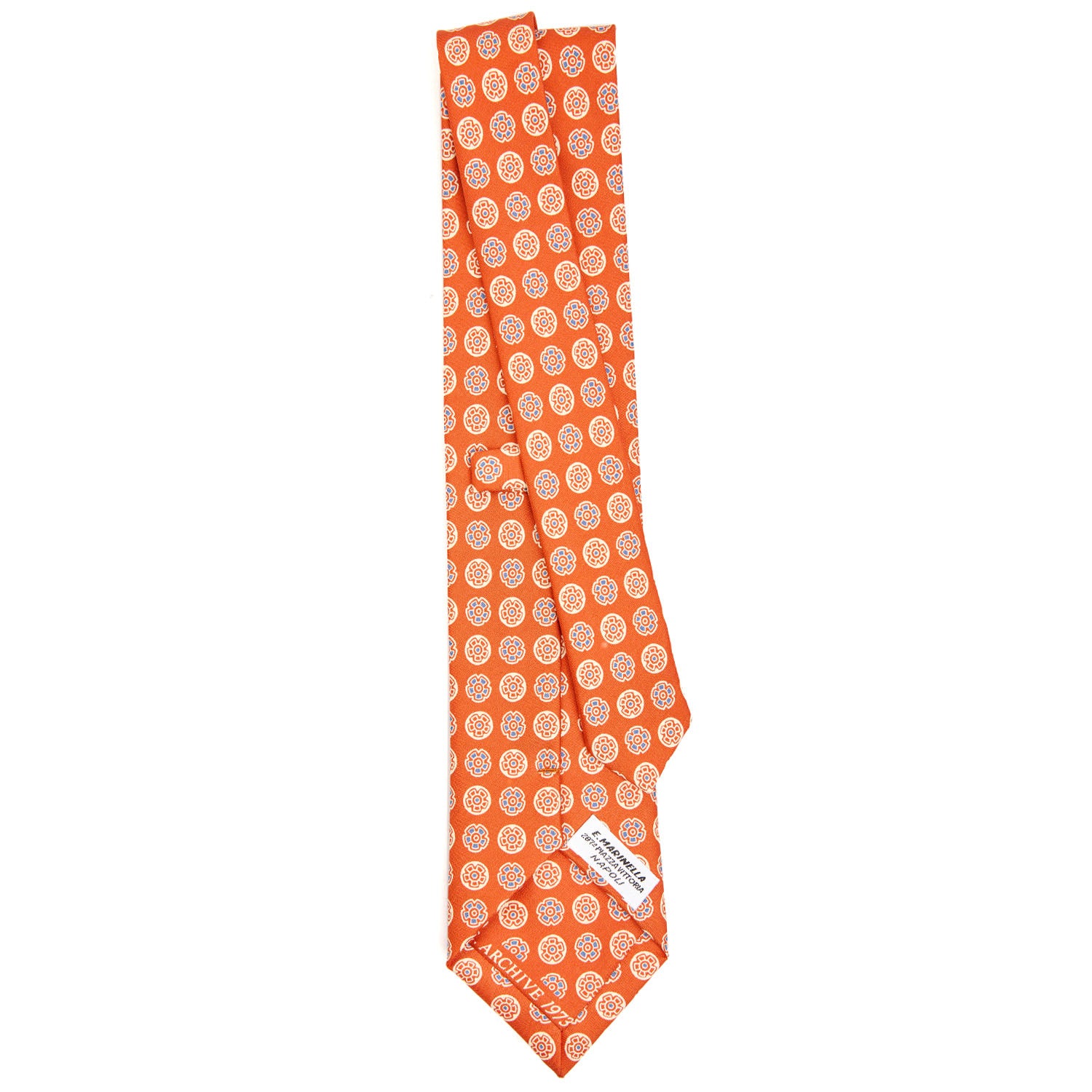La cravatta fa parte della collezione Archivio, che propone in chiave moderna le stampe storiche dal 1930 al 1980. Gli anni '70 sono caratterizzati da motivi più vivaci e densi, a volte anche barocchi. I colori sono chiari con sprazzi di arancio, rosso brillante e bianco. Una cravatta dal carattere prepotente.