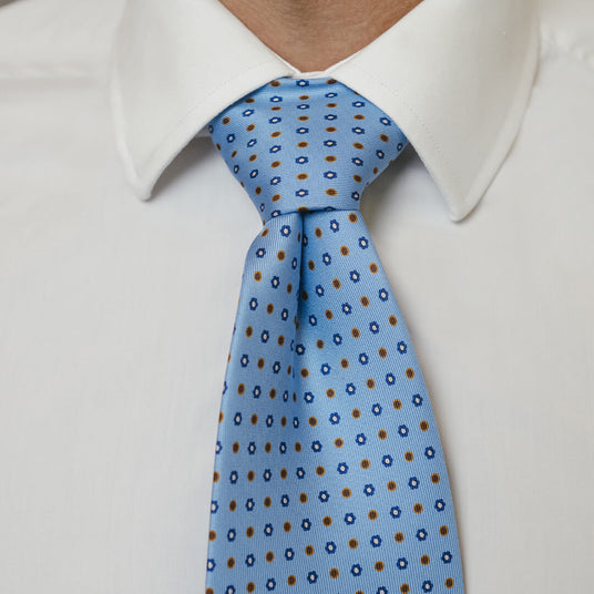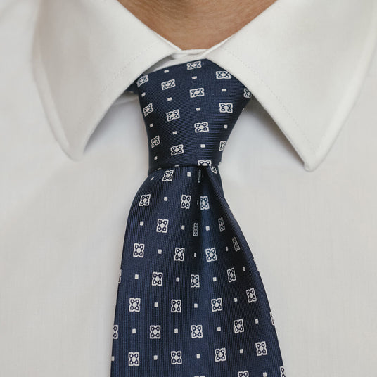 Take the wide end of the tie (A) and fold it over the narrow end (B) at 180°, cross (B) over (A), bring (A) over (B) and slide it through the loop towards the collar. Pass (A) through the knot and pull gently.