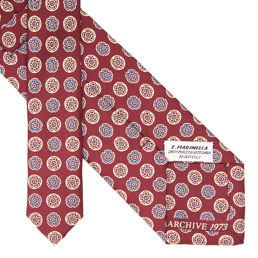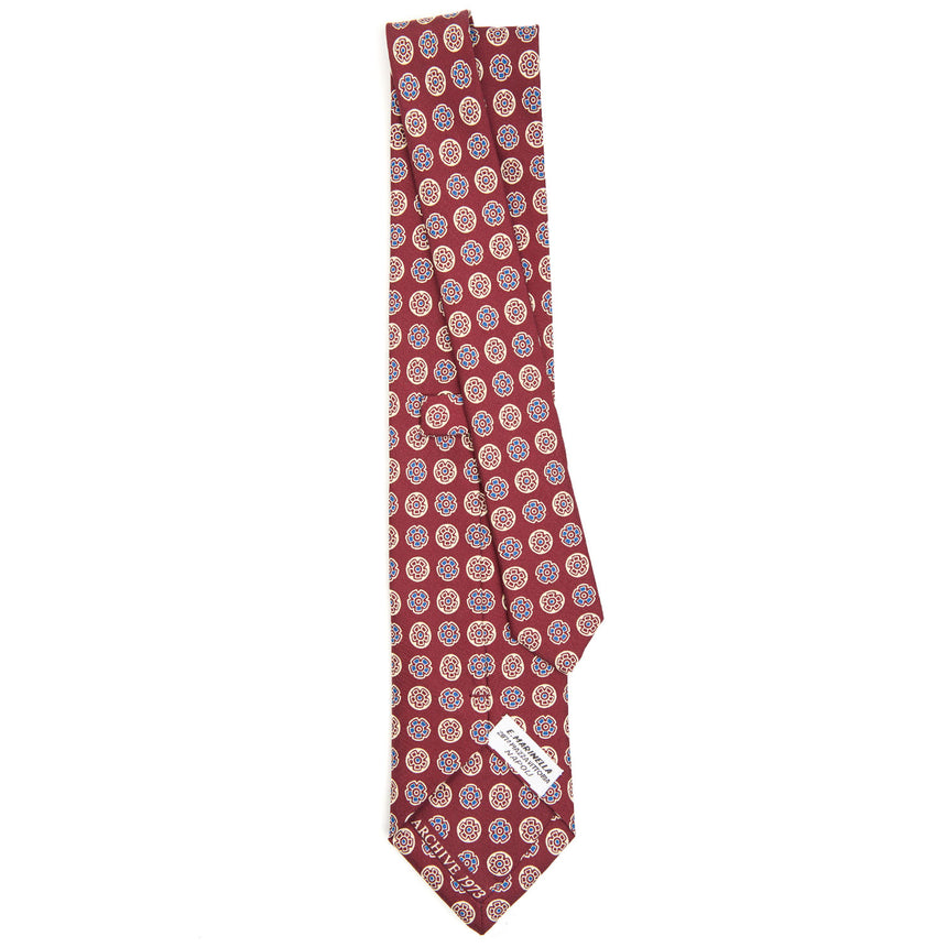 This tie is part of the Archivio collection, which offers historical prints from the 1930s to the 1980s in a modern way. The 1970s are characterised by more lively and busy motifs, sometimes even baroque. The colors are light with splashes of orange, bright red and white. A tie with an assertive character.