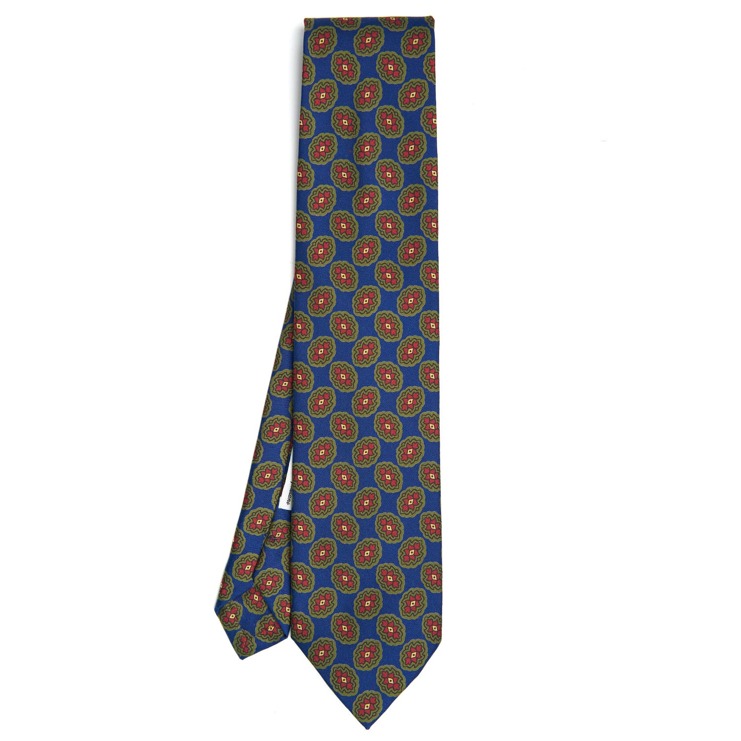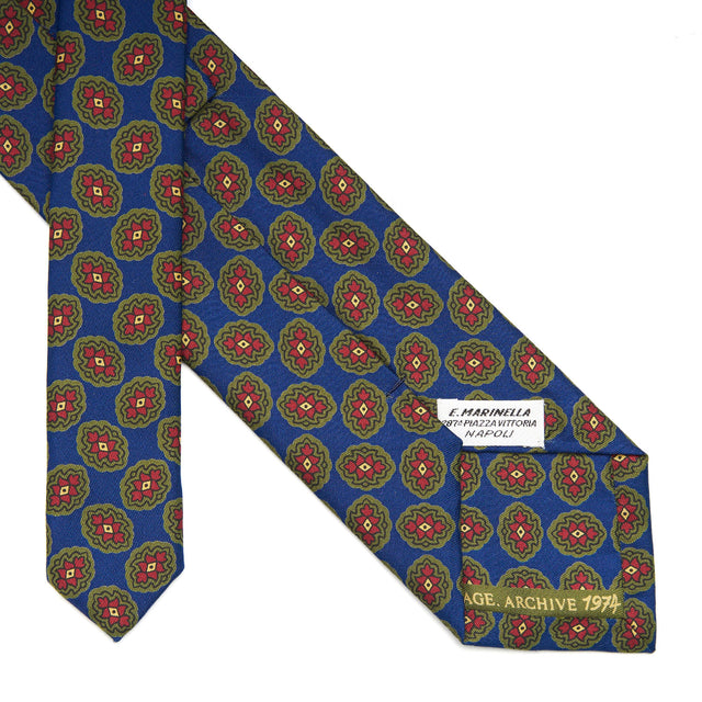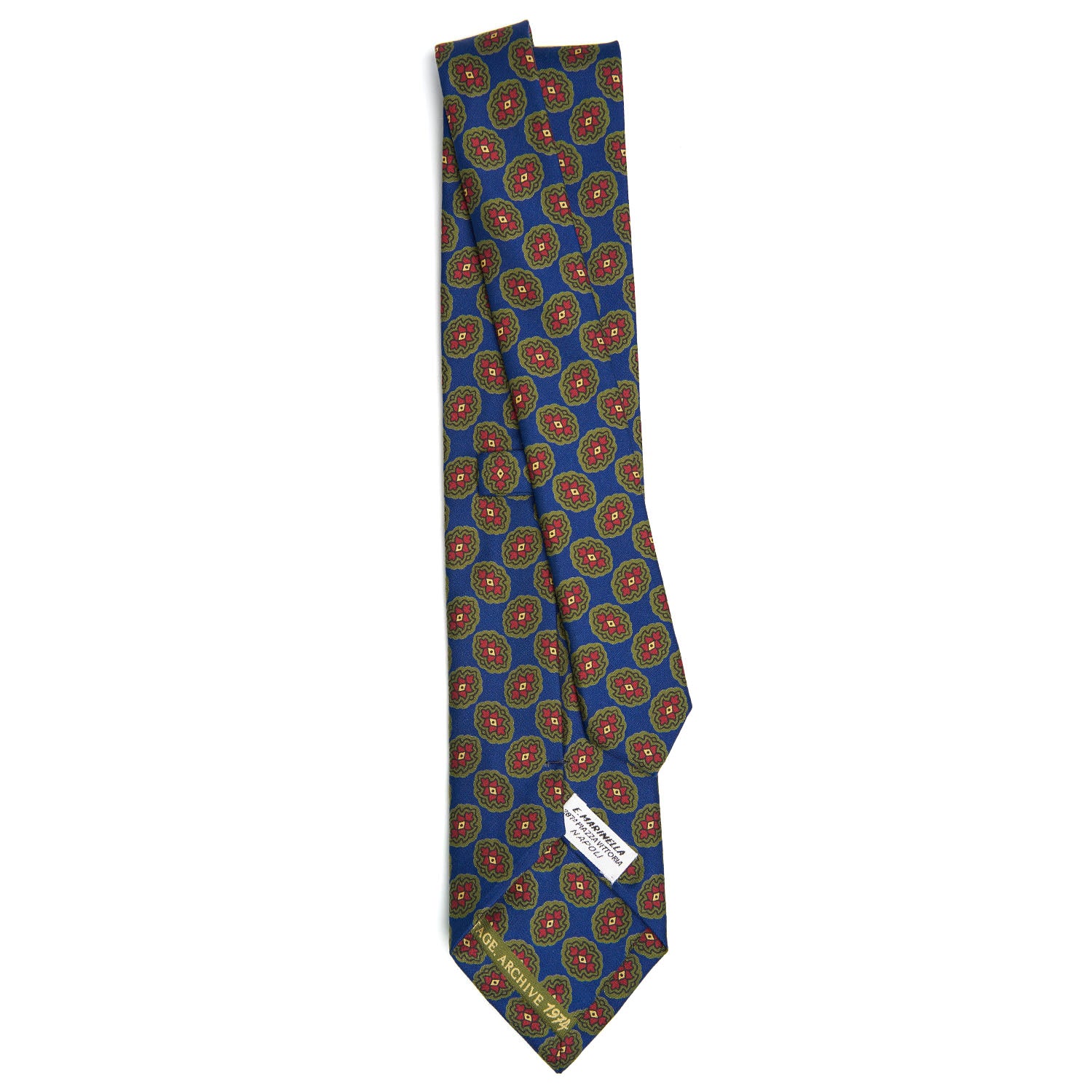 This tie is part of the Archivio collection. which offers historical prints from the 1930s to the 1980s in a modern way. The 1970s are characterised by more lively and busy motifs,sometimes even baroque. The colors are light with splashes of orange, bright red and white. A tie with an assertive character.