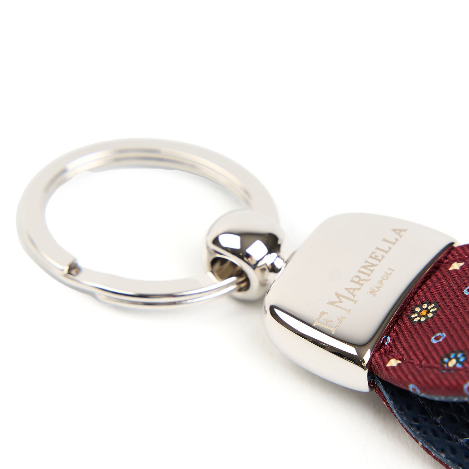 Keyfob with ring and loop in leather and silk, featuring a classic E. Marinella pattern.
