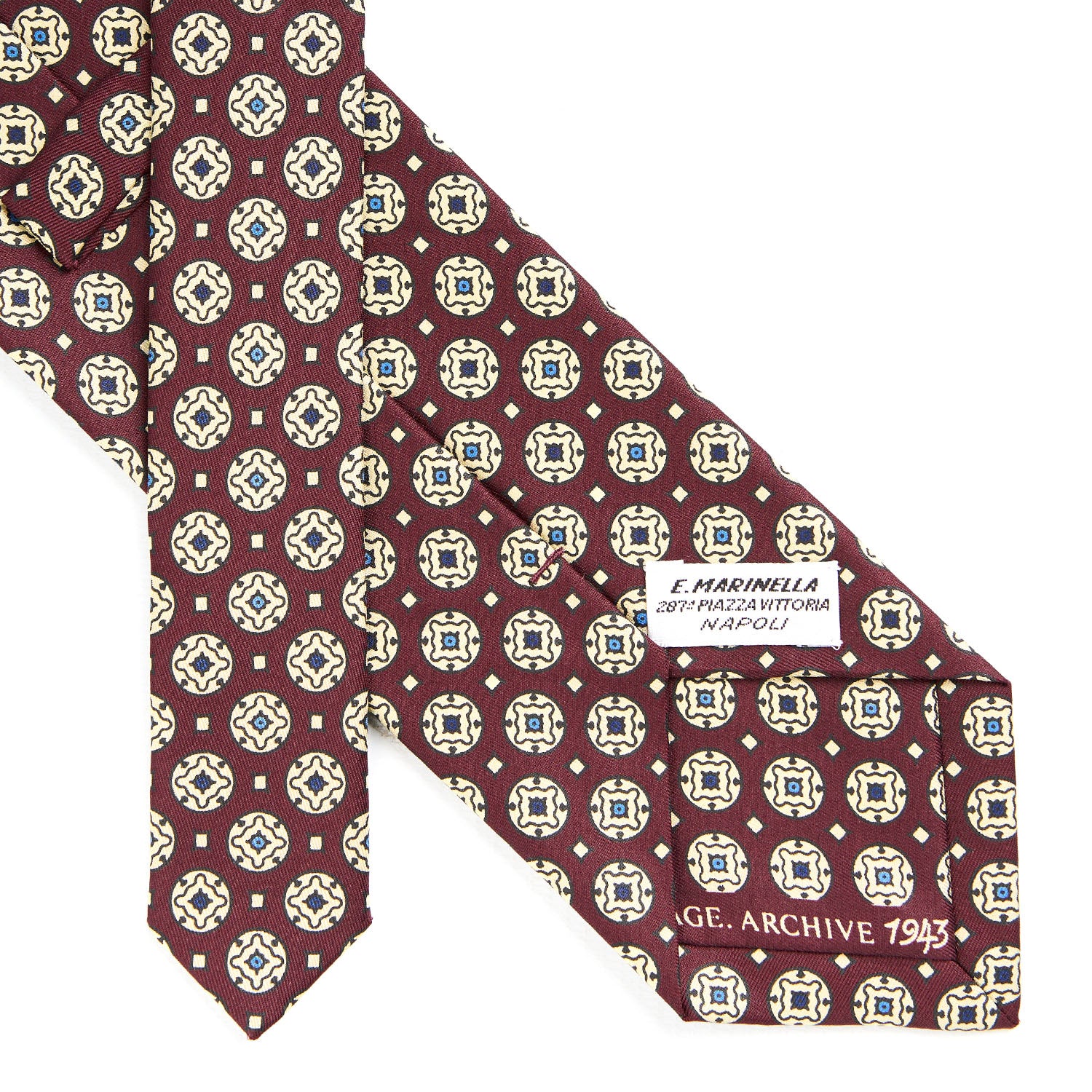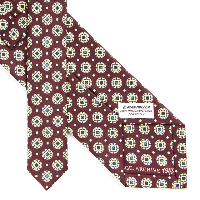 This tie is part of the Archivio collection which offers, in a modern way, historical prints from 1930s to 1980s on lighter weight silk, as it was at the beginning of the century. The patterns of the 40s are characterized by subtle colors with a predominance of blue and burgundy, sometimes illuminated by light blue, and more intricate designs. the result of a combination of small designs. A tie that appears formal but still with a playful touch.