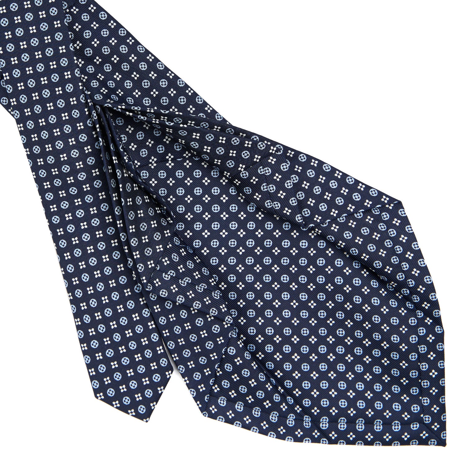 The seven-fold tie from E.Marinella is a completely artisanal product. from the hand-printing of the silk. to individual cutting of each piece of fabric. to the closing of the finished product. This is a particularly precious tie. because of the greater amount of silk used: the silk square is folded on itself seven times. giving the tie a fuller consistency. even at the height of the knot. and weightiness.