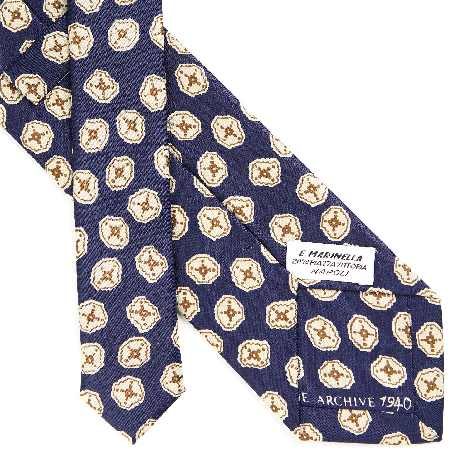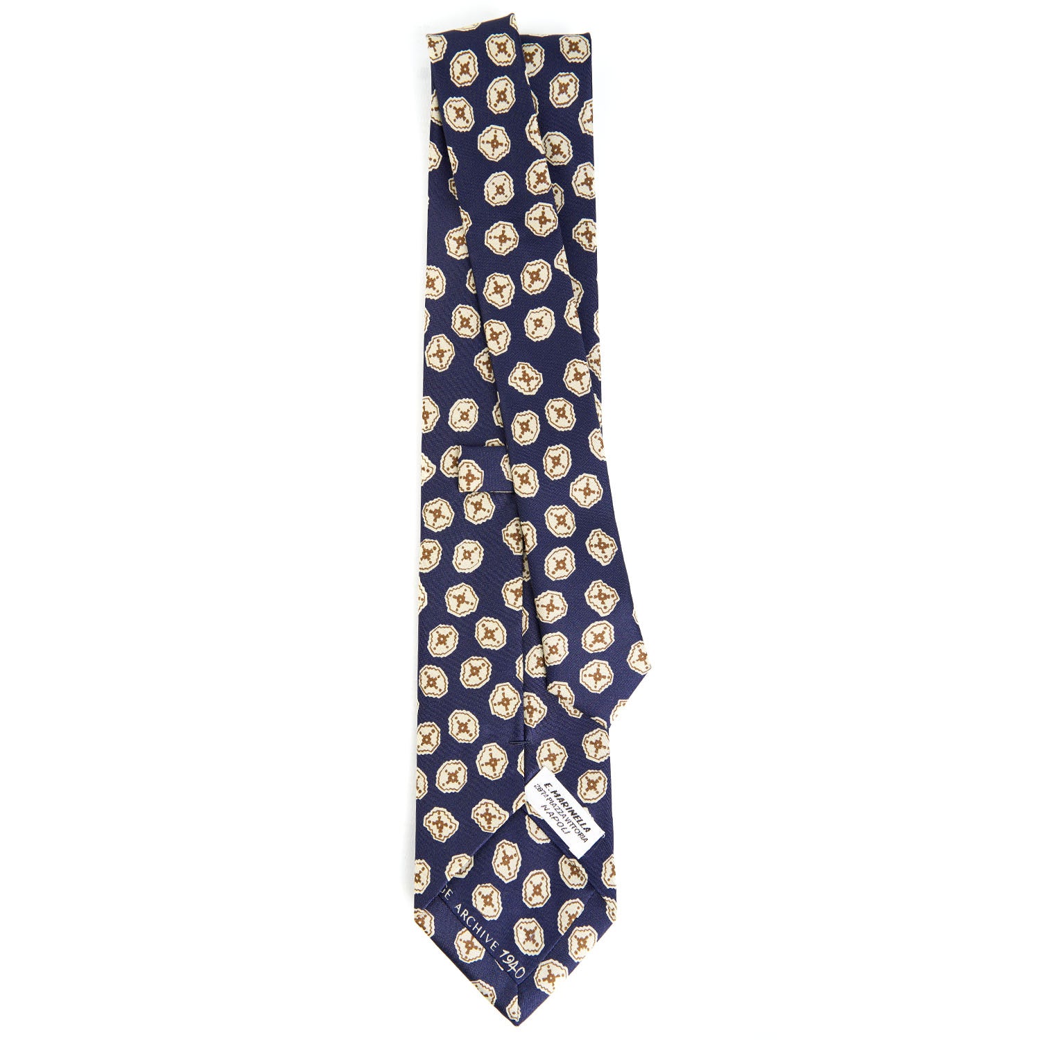 This tie is part of the Archivio collection which offers, in a modern way, historical prints from 1930s to 1980s on lighter weight silk, as it was at the beginning of the century. The patterns of the 40s are characterized by subtle colors. with a predominance of blue and burgundy, sometimes illuminated by light blue, and more intricate designs, the result of a combination of small designs. A tie that appears formal but still with a playful touch.