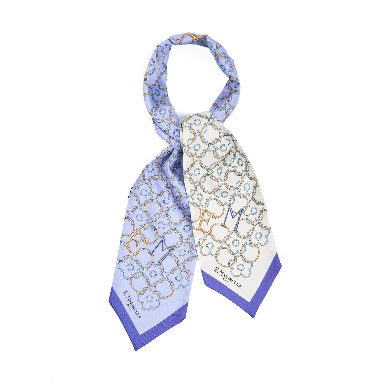 The silk bandeau with the Monogram 100 Flower pattern by E. Marinella plays with the Maison’s century-old flower, creating a chain motif alongside the brand’s monogram, presented as charming pendants. Made in the size of 12 x 115 cm, it becomes a multifunctional accessory that can be worn around the neck, in the hair, or to add a touch of character to our bags. Made from printed silk, it is the expression of Italian craftsmanship. Made in Italy.