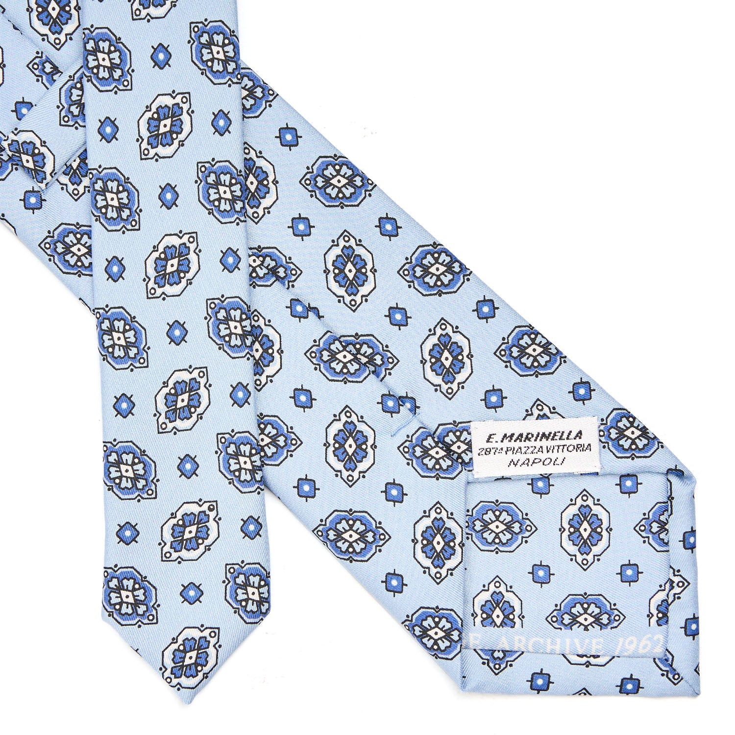 This tie is part of the Archivio collection, which offers historical prints from the 1930s to the 1980s in a modern way. The 1960s saw the return of large patterns together with smaller ones in particularly dense designs. Houndstooth and lighter colors, such as white and light green, make their first appearance. Ties with particular designs to complete a look with personality.