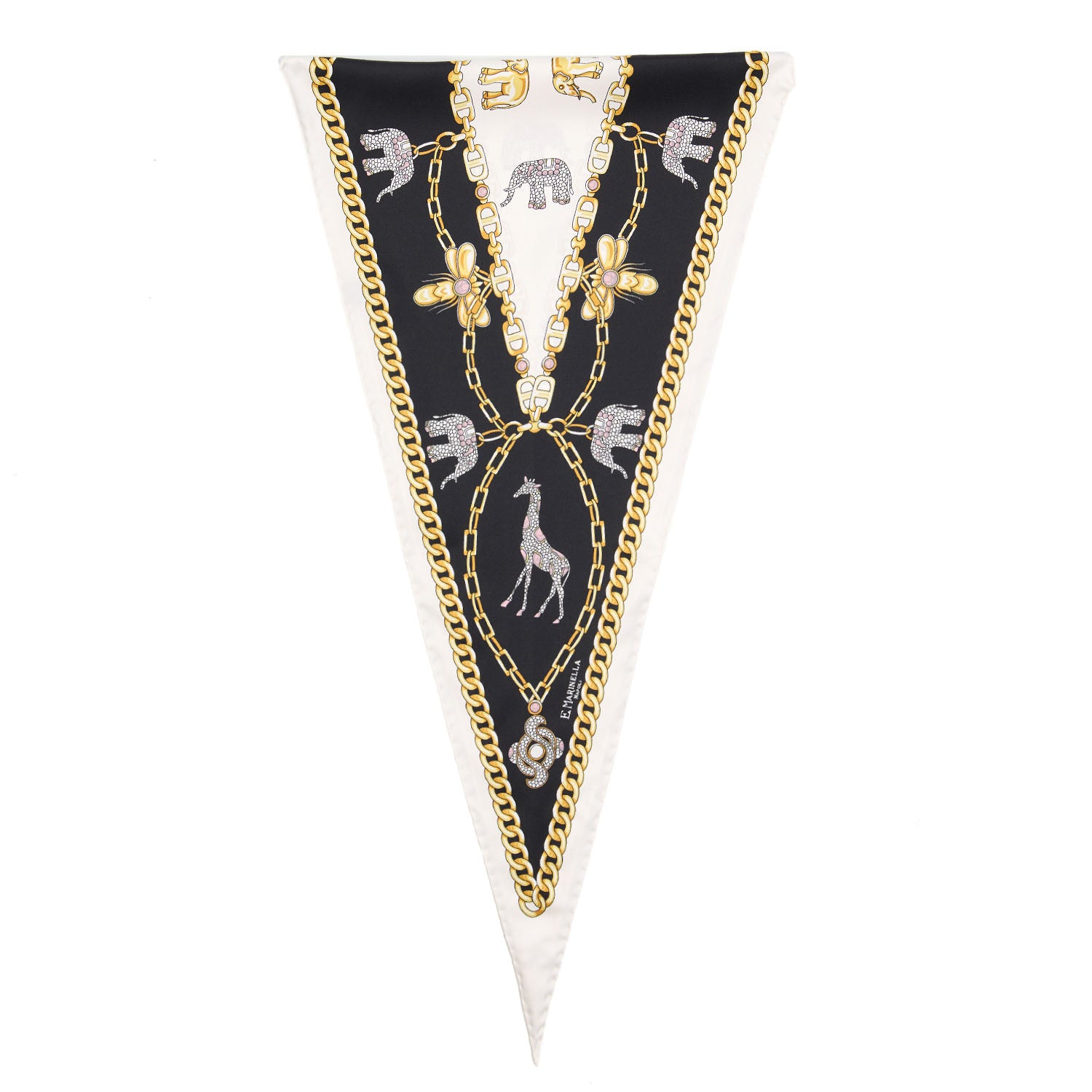The silk diamond-shaped scarf are inspired by symbol of protection, strenght and good fortune for the Maison.  Its shape allows it to be worn around the neck or at the waist to enhance a dress. Made from fine silk and fully hand-hemmed, it is the expression of Italian craftsmanship.